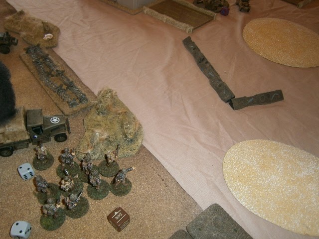 The Stuka returns and takes out a GI squad that pose a threat to Pioneers with a pair of bombs. The DAK pioneers retreat 6" and flame the Sherman, which fails its motivation... The next dice 4 DAK troops assault the M3 to block off an assualt on the pioneers, but the 1st Lt jumps out and holds off the wiping out teh attackers and consolidating near the german officer. The german Leutnant attacks, wins but is assaulted in turn and despatched by more GIs who consolidate near the pioneers. The small SMg DAK unit runs to assist the pioneers but is charged by the Colonel, as teh US get desperate. The command team dont kill anyone, and gets wiped out. The DAk then gets mortared but only gets pins... The Flak track takes out the M3