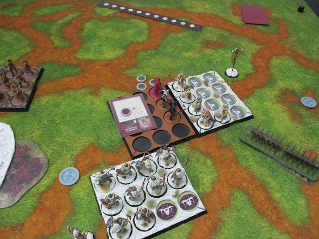 We decided to play A Game of Thrones, as that's what Colin and Andy were playing. The was set up with bog on my left, two Weirwood trees central and some spikes. The Cntral onjective gave an extra card and hand limit increase, top left Sundering in melee, bottom left out vulnerable to opponent, bottom right 3" shift and top right precision.