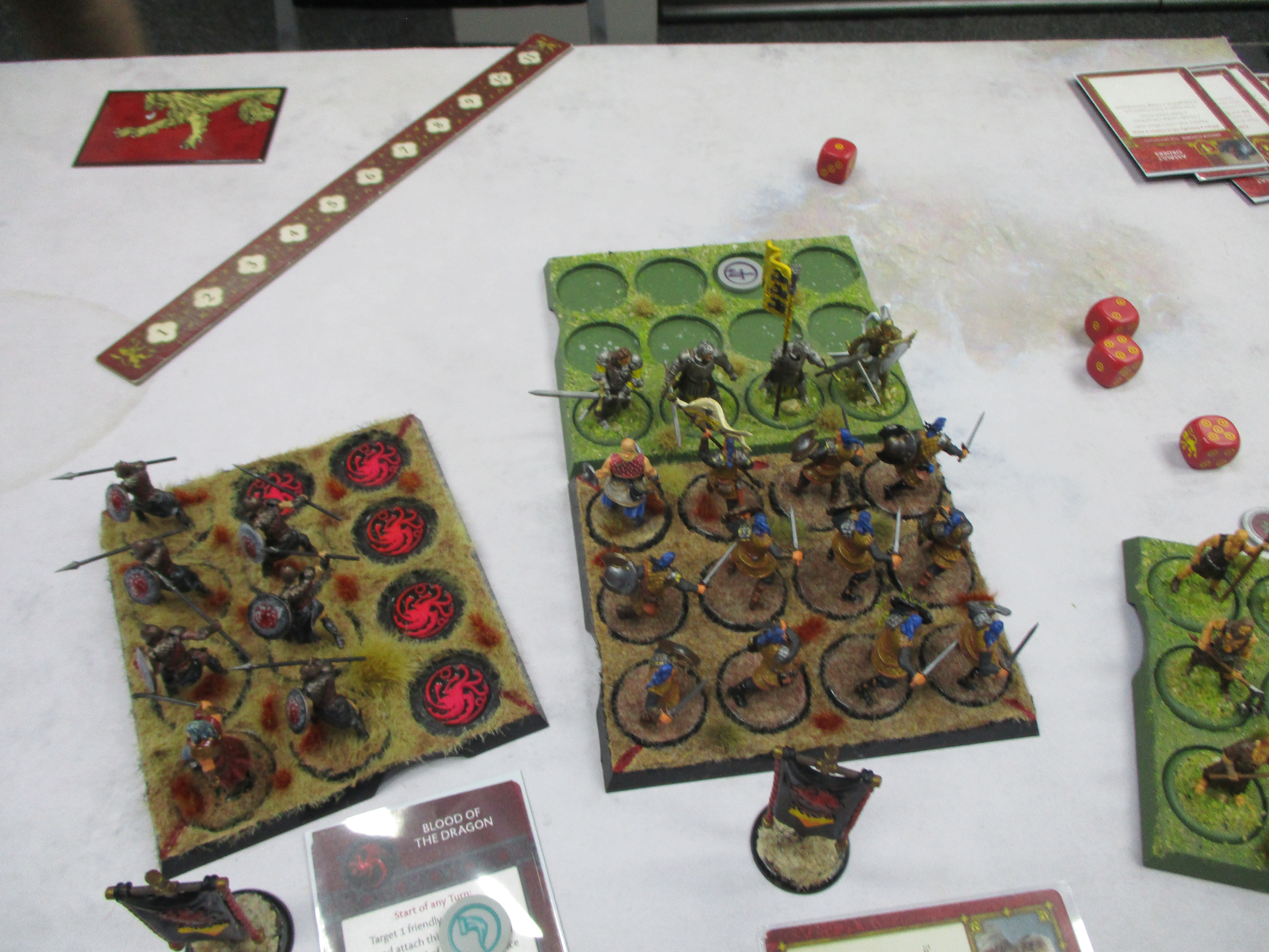 I took some wounds on the Hrakkar and some card tricks left the Mountains men healed up a bit. But Daario and his Unsullied applied the pressure, advancing up to the Red Cloaks and taking the central objective while having Blood of the Dragon card, while my Stormcrows camped on the edge ones as did the poor Fellows.