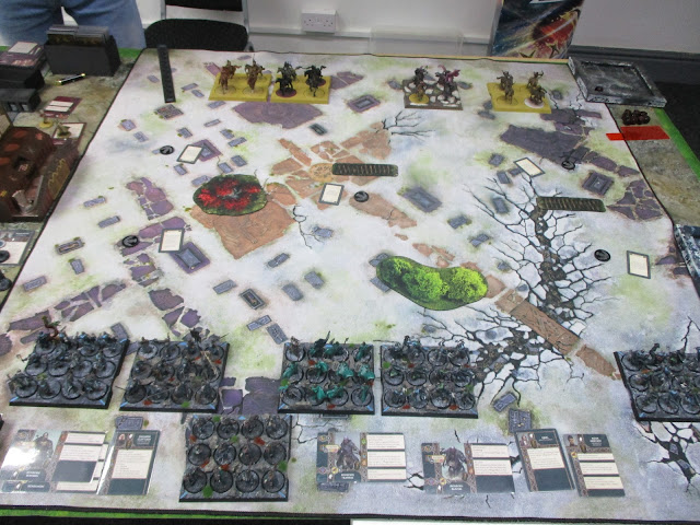 Centre of board at end of game. Ed played the Dragons well, and had me dancing to his tune throughout. Mother of Dragons is a tough army to beat, and I have not had much practice against them. Still, the remaining two had a few wounds, and I'd only lost half my force. A good learning experience, and weird that neither of us scored of the cards.