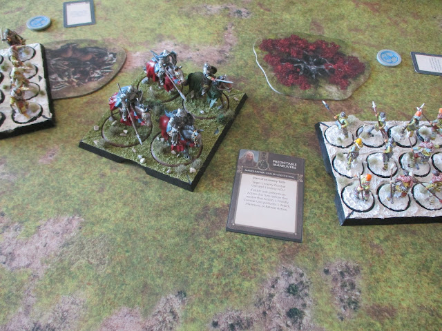 I played Predictable Maneuvers, targetting Baelish and his Tully Cav preventing Steve from activating his Tully's (as I could shift and charging volley with the Spearwives)