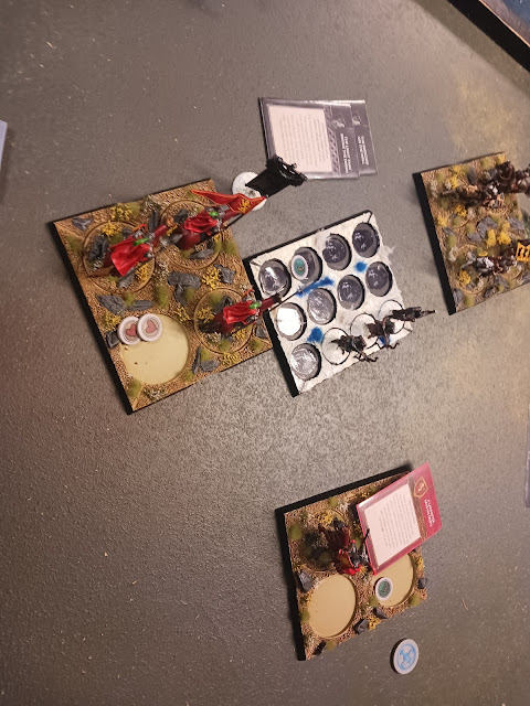 I went first and had Sam take the horses and advanced the Spearmen up the centre. When Ian countered with Marsalen's Pikemen I used the Watch Marshall to shift up the spearmen before they activated adn marched onto the centre objective