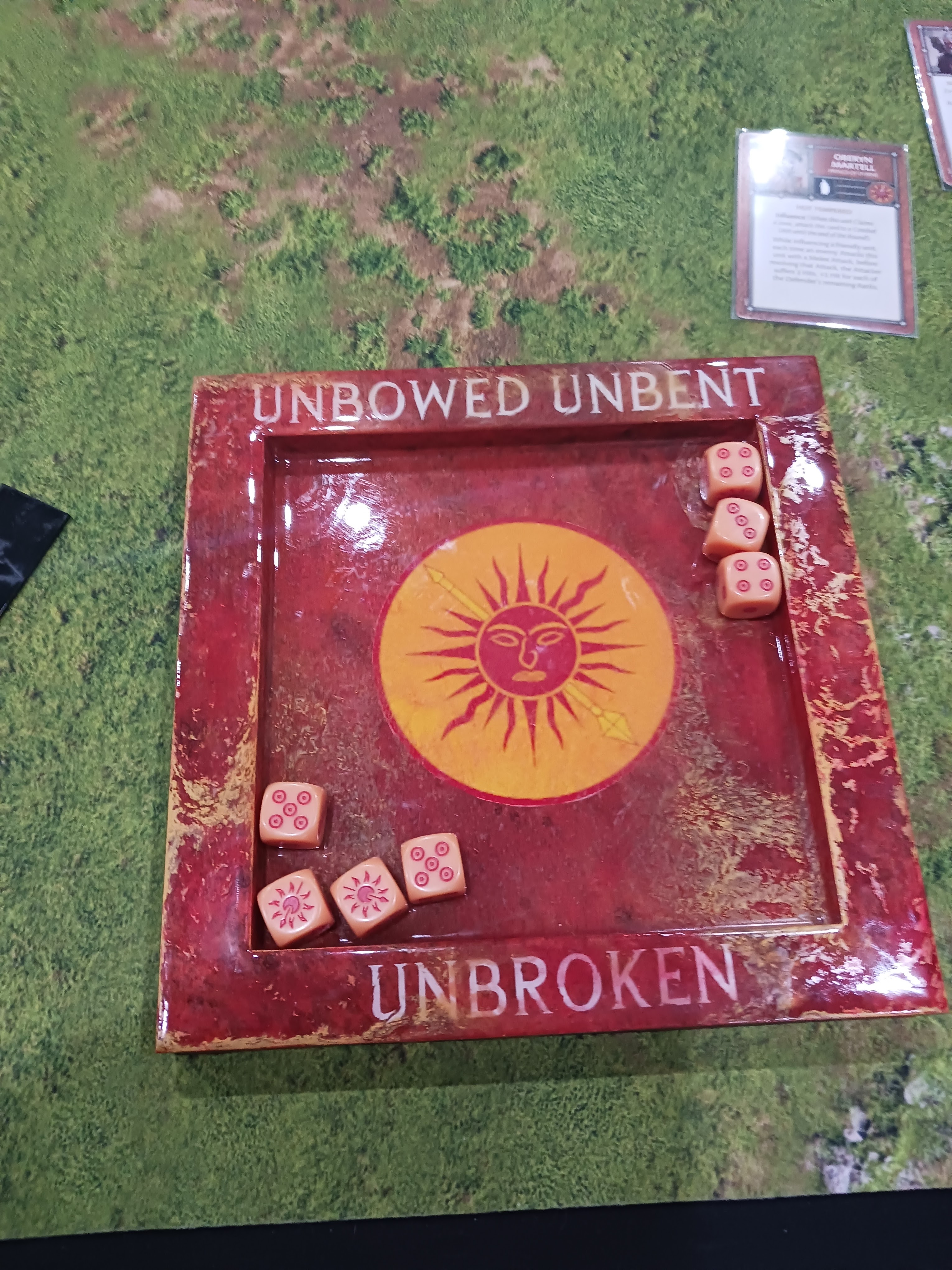 Unsurprisingly, Colin used a Donal token to prevent using the vulnerable, reroll saves and given the bog denying me re-rolls, only suffered three wounds. He passed his panic, and I used Spiteful Truce to heal two wounds on the Golden Company