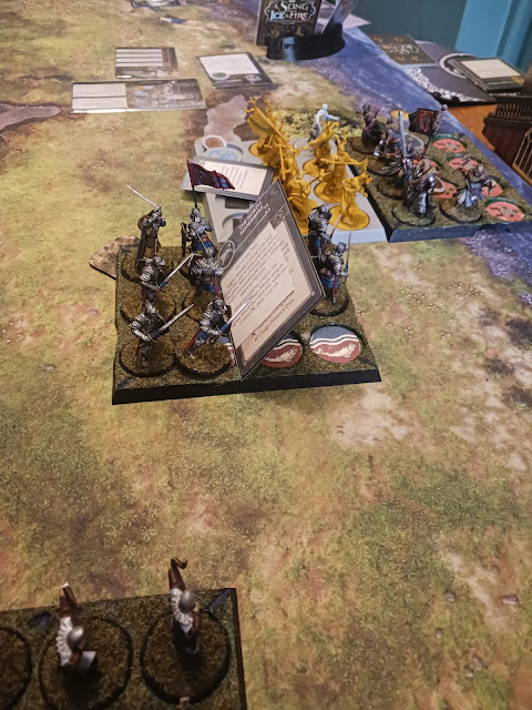 The Lightbringers armour was pretty resilient though, and he only lost three, passing the panic and using Baratheon Conviction to heal two. The the Queens Men charged Robb, becoming Disorderly due to Superior Positioning. But Barry threw my Vulnerable token back at me with Stags Wit